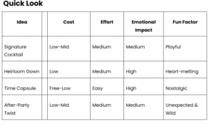 A signature sip that feels like “you,” and heirloom brought back to life and given a second or even third chance with wedding dress cleaning and restoration, a time capsule waiting for tears and laughter, or an after-party twist that keeps people raving and coming back for more.